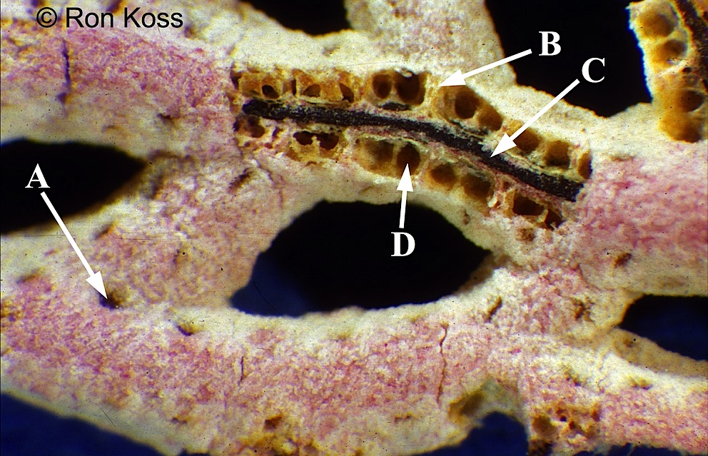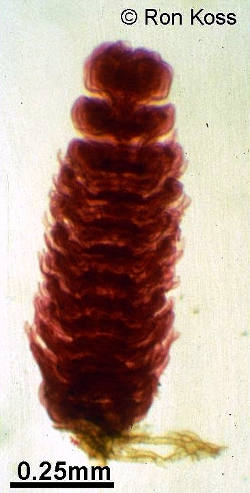 Test yourself by identifying the features labelled by arrows in these images. Can you name the higher taxonomic group to which each organism belongs? If not, use the key (for easiest use, hold the cursor down on the "key" link until you see the option "New Window with this Link"; this will open a second browser and allow you to view the key and the study image at the same time).